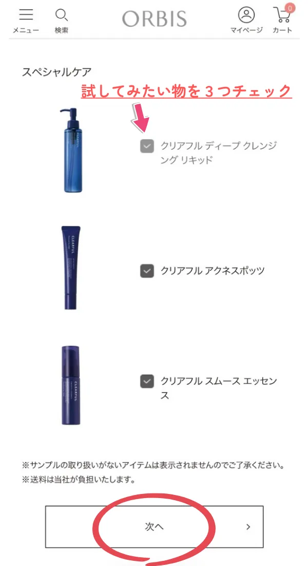 おすすめされたアイテムの中から試してみたい物を3つ選んで、「次へ」をタップ。