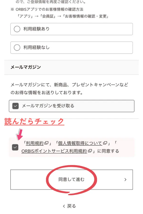 氏名・住所などを入力したら「利用規約」に同意するにチェックをし、「同意して進む」をタップ。