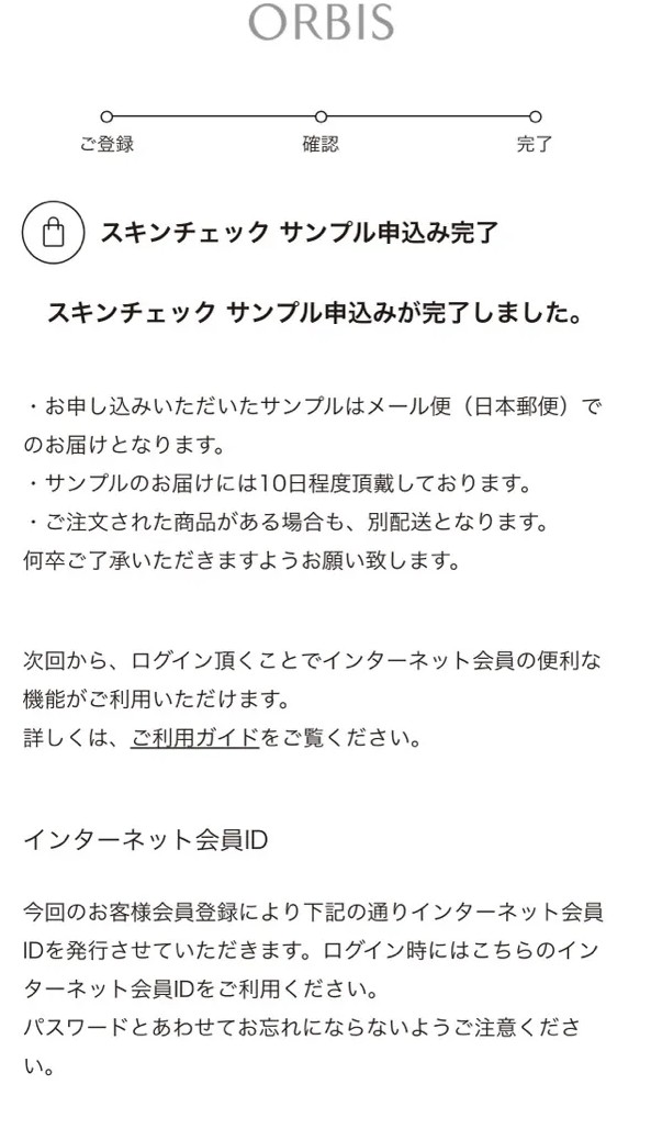 「スキンチェック サンプル申し込み完了」画面になれば、無料サンプルの申し込み完了です。